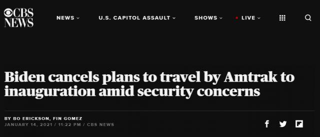 出于安全考虑,拜登取消了乘坐美国全国铁路客运公司(Amtrak)列车参加就职典礼的计划。