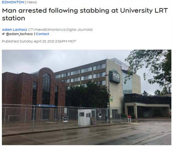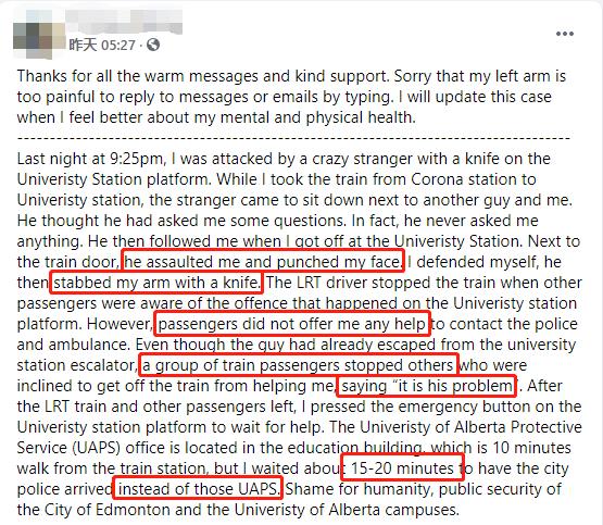 受害者(以下简称Z),是阿尔伯塔大学留学生。事情发生在24日晚9点25分,Z从Corona站乘坐地铁,去University站。其间,一名陌生人坐到了Z旁边。在到达目的地时,该名陌生人无端对Z拳脚相向,甚至打了Z的脸!Z应急自卫,但施暴者居然掏出刀子,捅伤了Z的胳膊。