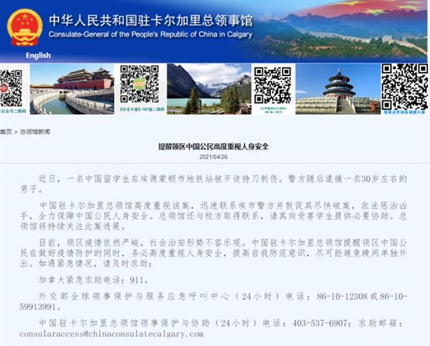 中国驻卡尔加里总领馆,对此事也是十分重视,立即联系警方督促破案并严惩凶手,保证中国公民人身安全。同时,领事馆也提醒中国公民注意人身安全。