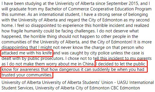 Z表示自己从2015年,一直在阿尔伯塔大学学习,今夏即将毕业。他一直视埃德蒙顿为自己的第二故乡,但这次事件,他认为让阿尔伯塔大学,和埃德蒙顿公共安全蒙羞。为了不让远在中国的父母担心,Z选择不通知他们,但他选择让当地公众知道,当你信任你的社区时,这将会是很危险的。