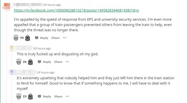 随即,周围乘客意识到发生了暴力行为,列车员也将车停在了University站。但是,当时并无一人协助报警或联系救护车。