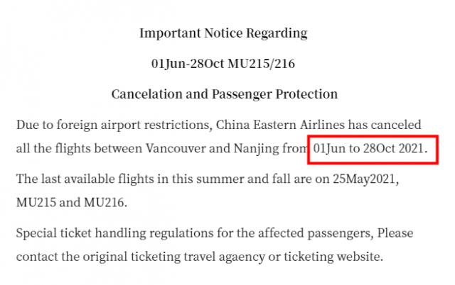 根据东航5月20日官宣,6月1日-10月28日期间,东航温哥华南京航线所有航班取消。5月25日的MU215、MU216是取消前的最后一个正常执飞航班。保留:每周五上海-多伦多航线。