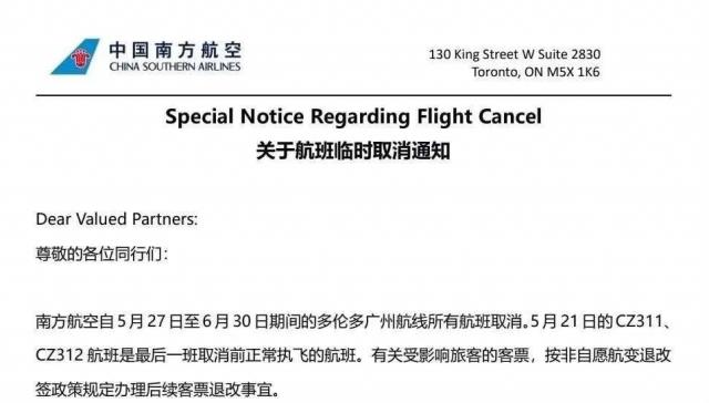 根据中国南方航空发布的《关于航班临时取消通知》,5月27日-6月30日期间,多伦多广州航线的所有航班正式取消!5月21日的CZ311、CZ312航班是取消前最后一班正常执飞的航班。有关受影响旅客的客票,按非自愿航变退改签政策规定办理后续退款事宜。