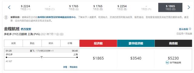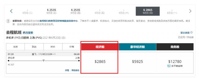 加航官网显示,6-7月多伦多/温哥直飞上海的票价从$1,800-$2,800不等。