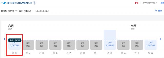 厦航官网显示,6-7月温哥华-厦门的票价从$2,500-$3,100不等。