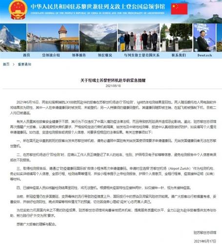 随即,中国驻苏黎世总领馆,发布了一则关于转机回国的紧急提醒。