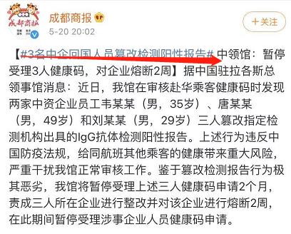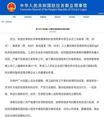 无独有偶,就在昨天(5月20日),又有媒体曝出,有三名中企员工从拉各斯登机回国时,私自篡改IgM血清抗体的阳性检测报告。目前当地中国领事馆已经暂停受理,三人健康码申请2个月,并且对三人所在企业进行熔断2周。