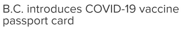 9月13日起,卑诗省府将要求12岁以上符合资格的民众,在出席部分活动或进入某些场所时,必须出示接种过最少一针疫苗的证明。10月24日之后,民众将需要提供已经接种两针疫苗至少7天的证明。