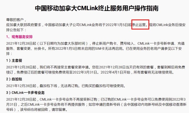 在中国移动加拿大官网“终止服务用户操作指南”中,中国移动加拿大表示,应加拿大联邦政府要求,中国移动加拿大子公司CMLink业务将于2022年1月5日起停止运营。根据该指南,中国移动加拿大自2021年12月28日起(加东时间),停止新用户购卡、携号转入、CMLink一卡多号新申请、充值服务、套餐变更、补换卡。所有2022年1月5日前未启用的SIM卡无法再启用。
