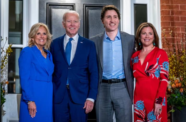美国总统乔·拜登和第一夫人吉尔·拜登于 2023 年 3 月 23 日在渥太华的里多小屋会见总理贾斯汀·特鲁多和他的妻子索菲·格雷瓜尔·特鲁多时向媒体成员摆姿势。 (安德鲁哈尼克/美联社照片)
