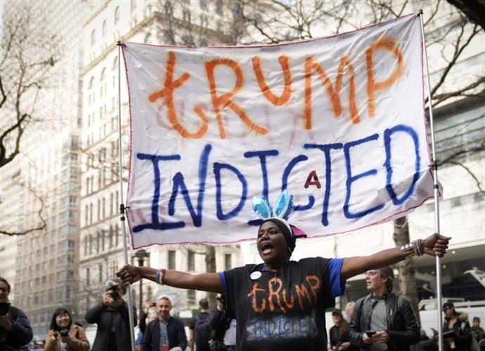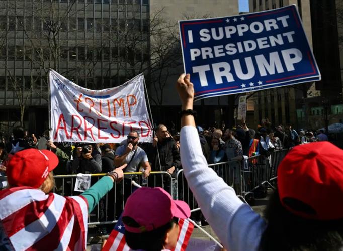 数百名特朗普支持者聚集在曼哈顿法院对面的公园里欢呼和吹口哨,人数超过了他的批评者。特朗普的批评者举着标语,其中一个是穿着条纹监狱制服关在监狱里的特朗普,另一个是“把他关起来”。