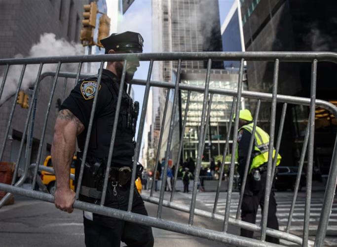 周末,警方开始在特朗普大厦和曼哈顿刑事法院大楼附近设置路障——特朗普周一从佛罗里达飞抵这里。