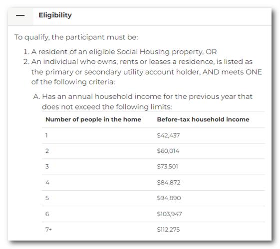 居住在安省的人(包括那些生活在电网连接的原住民社区的人),作为房主或租房者负责支付他们每月的电费的人,都有资格参加这个项目。提供的支持类型将取决于上一年的家庭收入水平和家住了多少人,或者是否获得了合格的政府或能源支持福利。社会住房的居民也有资格。