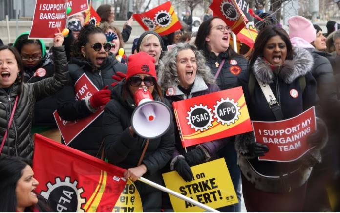 加拿大工会领导人周三上午在新闻发布会上说,代表加拿大12万多名联邦公务员的工会投票支持罢工。