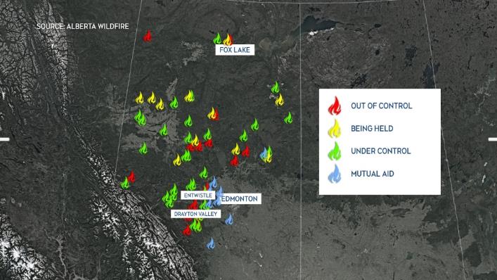 阿省省长丹妮尔.史密斯(Danielle Smith)将目前的山火情况形容为“前所未有的危机”!其中最严重的一处山火发生福克斯湖和彩虹湖。其中福克斯湖的山火面积约为4,400公顷,社区中近20座建筑物已被摧毁,包括皇家骑警站和北边的商店、自来水厂!