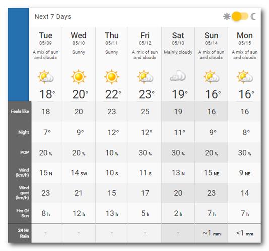 多伦多本周天气以晴天和晴间多云为主。最高温度基本都在20度,最低温度徘徊在10度左右。