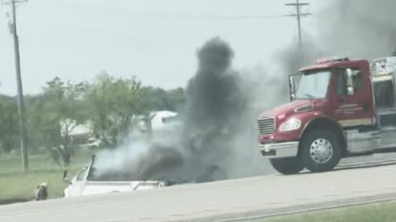 “在我们到达现场之前,我们看到了很多烟雾,”她说,在现场她看到一辆半挂卡车的正冒着烟,另一辆车严重受损。“车上什么都没有了,”她说,她以前从未见过这样的撞车事故。“我几乎要哭了,几乎要惊恐发作。”事故促使温尼伯健康科学中心宣布大规模伤亡事故橙色预警。