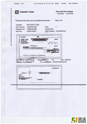 51网友Jack 汤称他在本地华人微信群中找人约好到银行换加币,结果由于对方出据是的一张假的银行汇票,导致他损失了近2万加元。现在,这位网友一方面在向银行投诉走程序,另一方面向警方报案,等待调查的进展,但是几个月过去了,仍然没有任何结果。