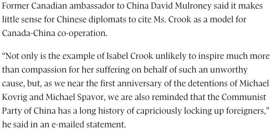 《环球邮报》的文章继续称,伊莎白和大卫在文革期间被拘留,加拿大前驻华大使戴维·穆洛尼(David Mulroney)认为,伊莎白“为了一个不值得的事业而遭受痛苦”,只会令人“同情”,而无法成为中加合作的典范。