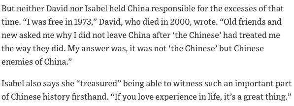 这就叫人看不懂了。无论是伊莎白,还是其丈夫大卫,都对中国的农村经济和文化事业做出了巨大的贡献,无私奉献了一辈子!在中国被捕的加拿大人,如何能相提并论?