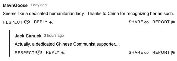 在网友留言中,也有网友表示,老太太看起来是个很敬业的、有人道主义的女士,感谢中国对她的肯定。但是立刻就有网友指出,“事实上,是个敬业的中国共产主义支持者”。