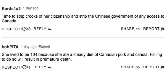 更搞笑的是,还有网友声称,老太太能活到100多岁是因为坚持吃加拿大猪肉和菜籽油,不然就会早亡。