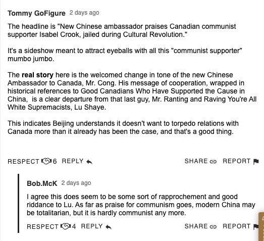 在丛培武大使赞扬伊莎白·柯鲁克之后,《环球邮报》迅速刊登了一篇长文,将伊莎白与前段时间在中国被指控从事间谍活动的两名加拿大人联系起来,抨击中国残酷对待外国友人。