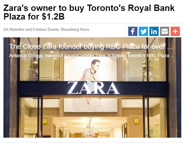 据彭博新闻报道,拥有全球服装连锁店巨头Zara的亿万富翁奥尔特加(Amancio Ortega)已同意以约12亿元(约合9.61亿美元)的价格,从两家加拿大退休基金手中买下多伦多的摩天大楼--皇家银行广场(Royal Bank Plaza)。