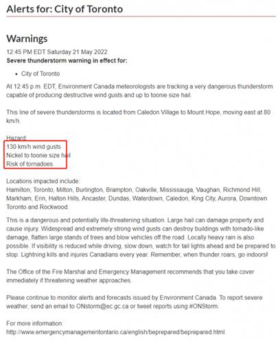 警报中指出:多伦多今天下午将遭遇一场非常危险的雷暴。