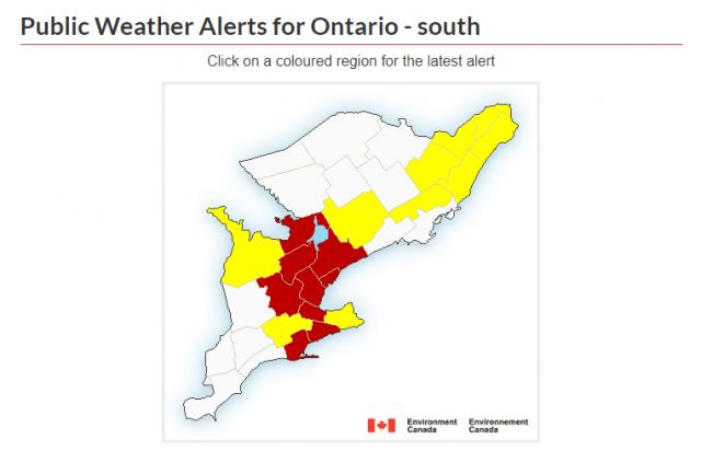 收到警报的人需要紧急注意:所在区域可能经历严重恶劣天气!加拿大环境部官网也对多伦多以及周边地区发布了红色警报: