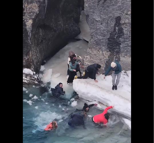 从网友日前拍摄发布的视频可见,一班游客在位于卑斯省的 Yoho National Park 沿着河上积雪行走,相信他们行走的地方并非行山径。正当大家从山洞走出之际,积雪突然融化沉入河中,走投无路的游客纷纷跌入冰冷的河水中,幸好全部顺利上岸。