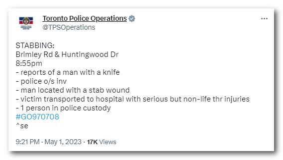 “刺伤案:晚上8点55分在Brimley Rd & Huntingwood Dr,报告说有一名持刀男子,发现有人被刺伤。一男子因严重受伤被送往医院但不危及生命。 一人被警方拘留。”