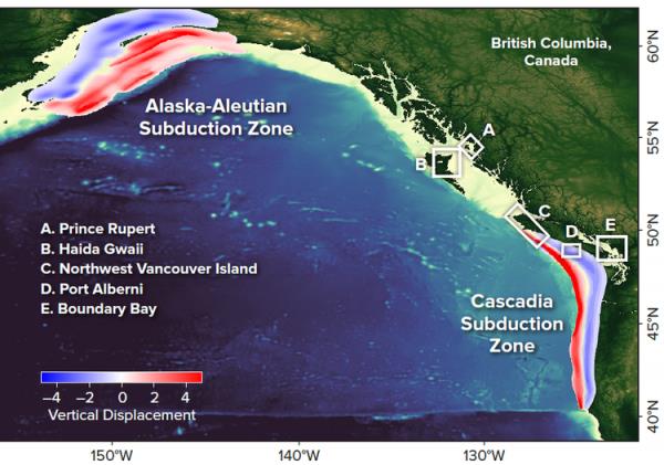 该主题的第二项研究发现,卡斯卡迪亚地区类似规模的地震将在大约3个小时内到达边界湾 (Boundary Bay),但波高会低得多,只有几英尺。「由于 1964 年的阿拉斯加地震导致创纪录的海啸袭击了卑诗省,因此人们对阿拉斯加-阿留申群岛俯冲带海岸很注意。由这一来源的巨型逆冲地震引发的海啸将对鲁珀特王子港 (Prince Rupert) 和海达瓜依 (Haida Gwaii) 产生重大影响,到达时间分别为 2.5 和 3.5 小时。
