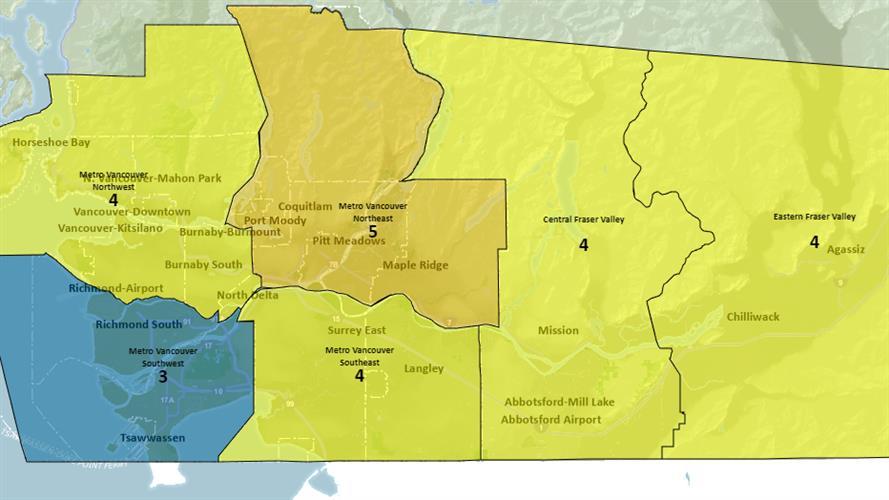 预计到周一晚上,菲沙河谷东部和中部的AQHI将达到 5,而大温西南地区的AQHI预计将升至4。