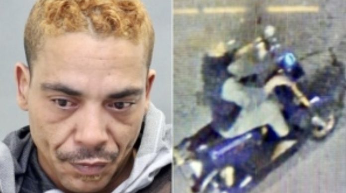 疑犯身高六尺,头发金色且卷曲,穿着一件深色皮外套、灰色裤子、浅色的New Balance运动鞋,骑着紫色摩托车。