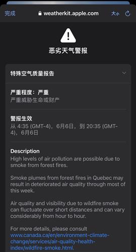 特别空气质量声明于今天凌晨表示“由于森林火灾产生的烟雾,空气污染程度很高。当地森林火灾以及魁北克森林火灾产生的烟雾导致空气质量恶化。”