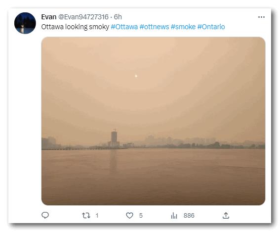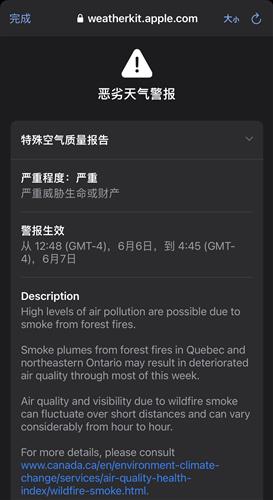安省魁省肆虐的森林大火产生的烟雾继续恶化多伦多的空气质量,一些地区的居民今早醒来时闻到一股“烧焦的烟味”。还有网友表示喉咙不舒服,过敏全天打喷嚏。