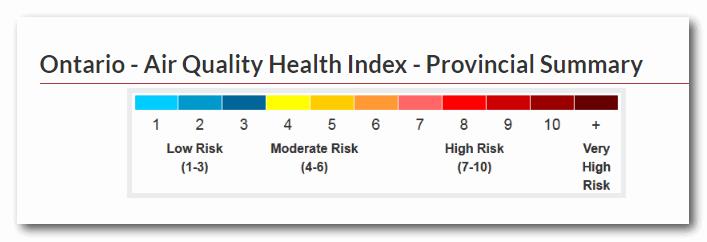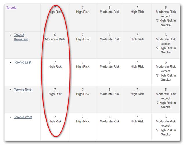 根据空气质量健康指数,多伦多地区目前处于高风险7级!