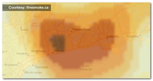 截至周二上午8点,安大略省环境、浓度和公园部(Ministry of Environment, Concentration and Parks)报告的空气污染物水平远远超过健康水平。细颗粒物浓度为每立方米267微克。