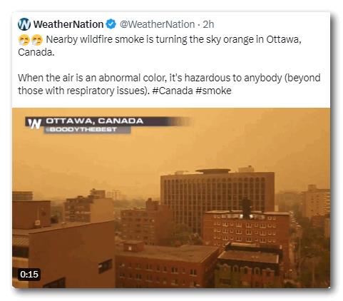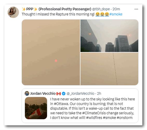 “今天早上它几乎像一堵墙一样出现在卫星上。我们已经追踪了几个星期,但是烟雾的来源发生了变化。其中大部分,99%来自魁北克省的大火。”