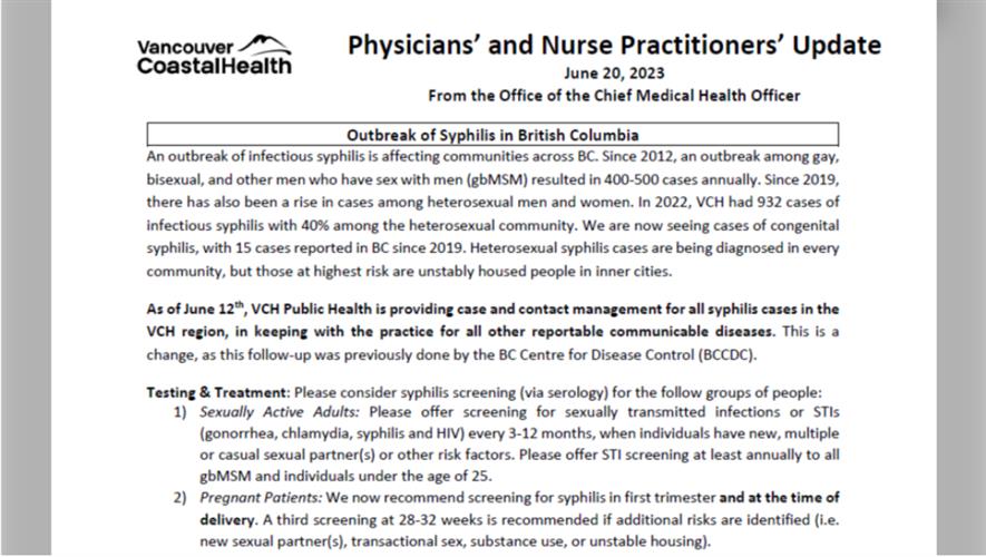CTV周三(21日)公布一份该媒体获得的医生和护士公告中,温哥华沿岸卫生局(Vancouver Coastal Health, VCH)敦促临床医生,每年对所有25岁以上性活跃的成年人,以及妊娠早期的孕妇进行年度筛查,然后在分娩时再次进行筛查。