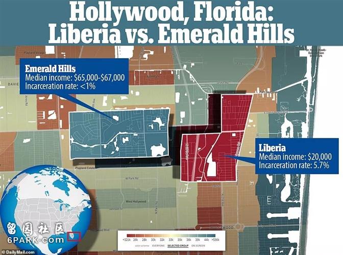 在佛罗里达州好莱坞市(不是加州的呦)有一条铁路。铁路左边Emerald Hill社区长的大孩子,他们平均年收入为$65,000-$67,000,入狱率不足1%。铁路右边Liberia社区长大的孩子就没有这么幸运了。他们年收入的中位数只有$20,000,不足全美平均年收入$49,192的一半,但入狱率却高达5.7%。