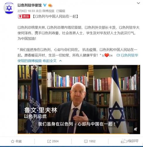 在北京,以色列驻华大使馆也专门播发了视频《以色列与中国人民站在一起》。在视频中,以色列总统、总理、外长、大使等纷纷亮相,为武汉打气,为中国加油。