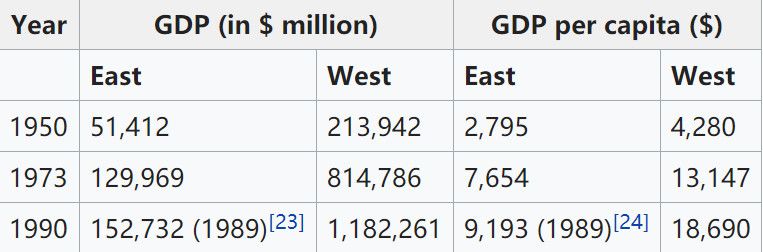 分裂之前的“两德”共为一家,实力相差不大;但拥有鲁尔区为代表的原西德地区,工业基础又明显强于原东德地区。分裂之后经济政策上的不同走向,导致差距越来越突出而明显:原东德地区越来越落后于原西德地区了,即使是在完成统一之后,这样的情形一时间也逆转不来。