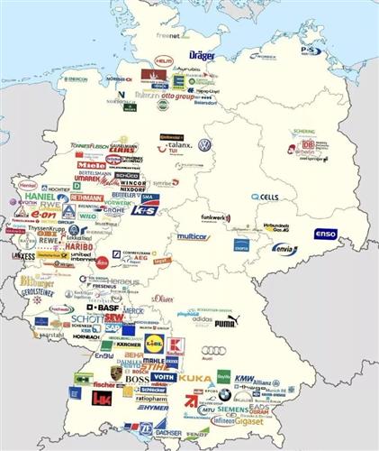 ▲德国知名企业分布图,大多集中在原西德区域,原东德则少得可怜