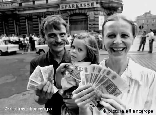 ▲在货币上进行统一。东德一家庭因兑换到新的西德马克而欣喜若狂