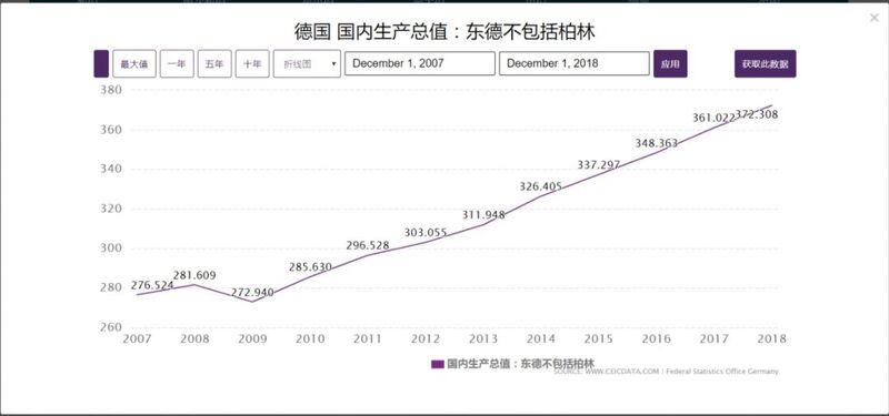 ▲近十年来东德的经济总量,保持着一个逐步上升的趋势