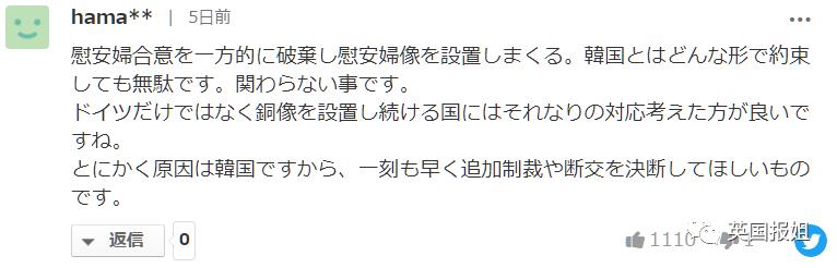 “单方面打破慰安妇共识,设置慰安妇雕像,不管用什么来约束韩国都是白费力气。而且不止德国,对那些同意设置慰安妇像的其他国家,也最好做出相应的准备。追根到底原因还是在韩国身上,必须当机立断施加制裁,赶紧跟他们断绝来往。”