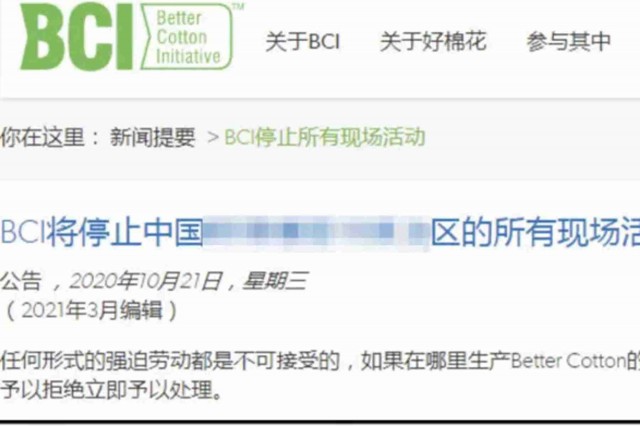 据中国官媒《环球时报》3月25日报道,有业内人士表示,从2019年起,BCI上海代表处的工作人员表示他们正在承受很大的外部压力,“我猜不排除是美国一箭双雕的手法,一方面污蔑新疆,一方面又能推出自己的棉花行业标准,分一块蛋糕”。