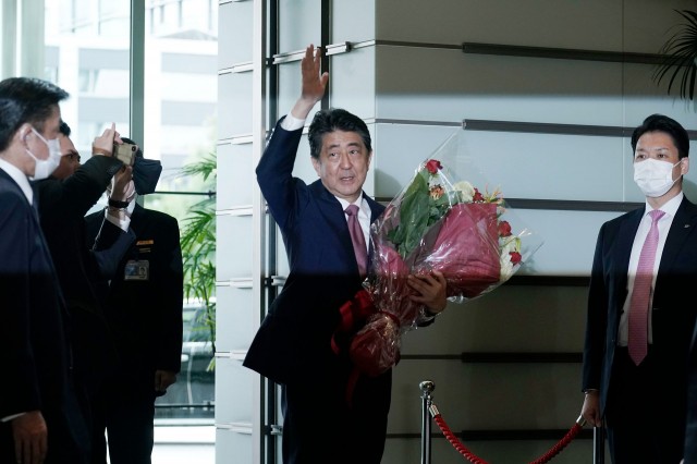 2020年9月16日,卸任的日本首相安倍晋三离开日本首相办公室时挥手致意。(Reuters)